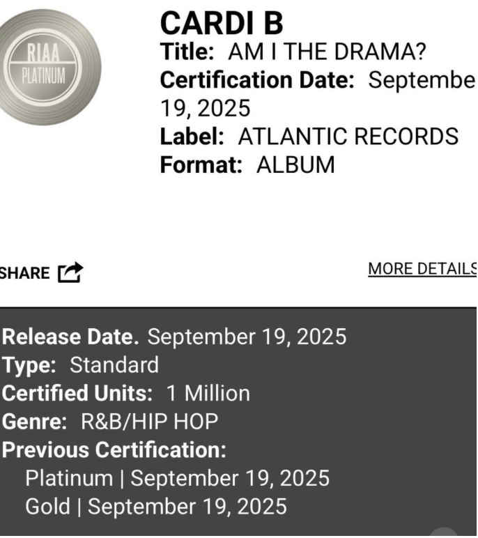 Latest Update: After this post went live, Billboard reported that Cardi B’s “Am I The Drama?” is officially certified platinum in the US after selling 1 million units hours after its release. This now makes her the first female artist in history to achieve this milestone.